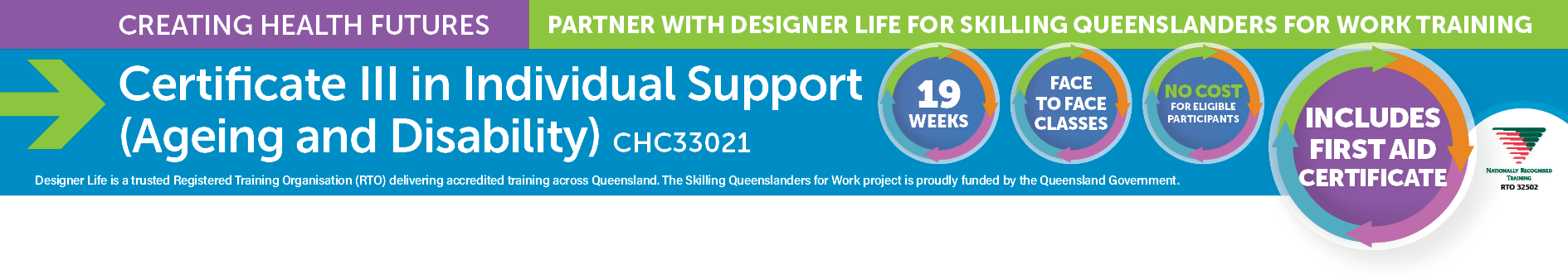 You’re on your way to exploring our No-Cost* CHC33021 Certificate III in Individual Support (Ageing and Disability) course held at our Designer Life Training Rooms.